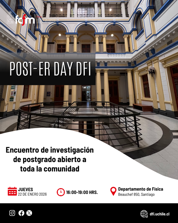 Invitamos a toda la comunidad del Departamento de Física (DFI) y la Facultad de Ciencias Físicas y Matemáticas (FCFM) de la Universidad de Chile a participar del Post-er Day 2026, una actividad organizada por la Unidad de Postgrado de nuestro Departamento, que busca convertirse en un espacio de encuentro, integración e intercambio científico.