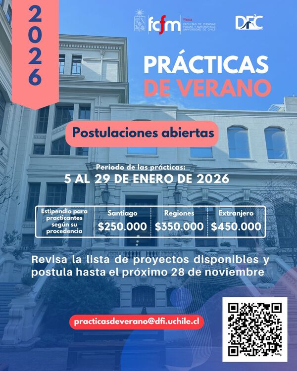 El Departamento de Física (DFI) de la FCFM de la Universidad de Chile, junto al Departamento de Física de la Facultad de Ciencias, llaman a postular a las prácticas de investigación de verano para enero de 2026, abiertas a estudiantes de Licenciatura en Física y carreras de ciencias afines, tanto de nuestra facultad como de universidades nacionales e internacionales.